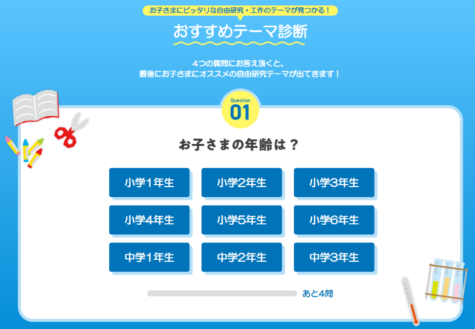 このサイトでは、学年や興味など4つの質問に答えるだけで、お子さまに合った自由研究テーマを提案してくれる「おすすめテーマ診断」を利用できます。複数のテーマ案を見られるほか、くりかえし診断できるので、お子さまが「気になる!」「これならやってみたい!」と思えるものがきっと見つかるでしょう。