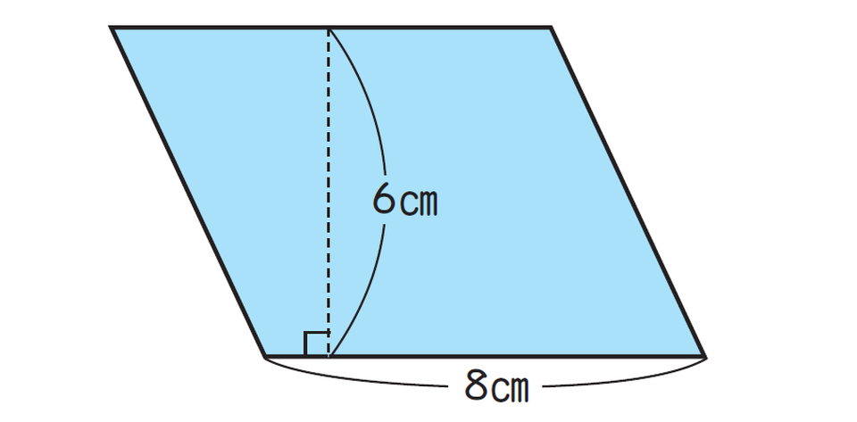 高さはななめの辺ではなく、底辺に対して垂直の直線を指します。この問題では底辺8cmに対して、垂直な線、つまり高さは6cmです。したがって、公式にあてはめて計算すると48cm²となります。答えには必ず面積を表す単位をつけましょう。