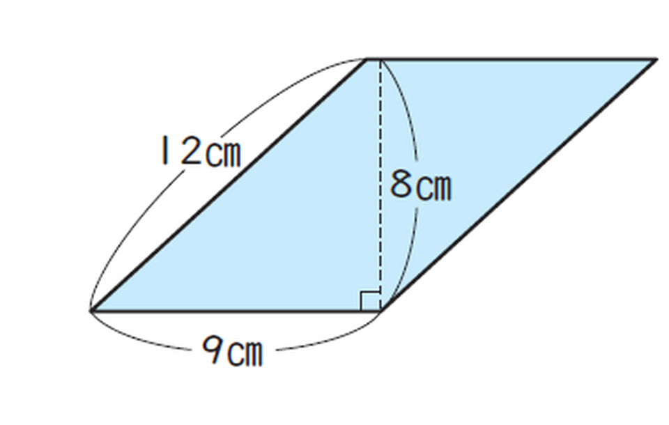 この問題では、12cmの辺は底辺に対して垂直ではないので、高さではありません。底辺を9cm、高さを8cmとして公式にあてはめて計算し、面積を求めます。お子さまにはヒントとして「底辺に対して垂直な線はどれかな?」などと声かけをし、高さにあたる線を探すのがポイントです。