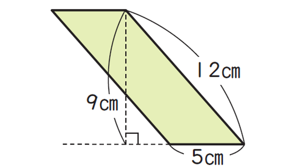 この問題では、底辺が5cm、高さが9cmです。12cmの辺は底辺に対して垂直ではないので、高さではありません。高さの表示が平行四辺形の中にあるか外にあるかは関係ないので注意してください。