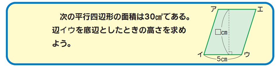 平行四辺形の面積と底辺から、高さを求める問題も見てみましょう。