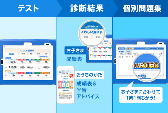 全国規模の実力診断テストではお子さまの学力を全国規模で判定します。4教科・単元ごとに細かくお子さまの学習理解度を分析し、お子さまに合った個別復習ドリルでニガテ単元を集中的に学習。さらにお子さまが伸びる勉強法も具体的にアドバイスします。