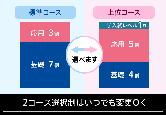 標準コースでは基盤を徹底、上位コースでは発展的な内容を中心に学習します。教科ごとにお子さまの得意や苦手に合わせて学べるので、無理なく応用力が自然と身につきます。