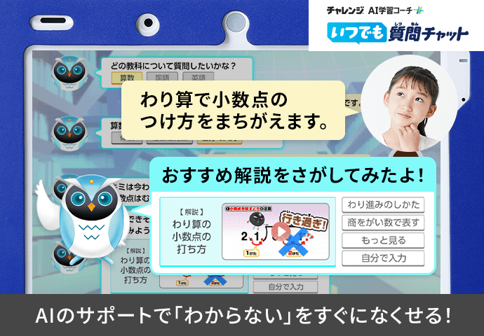 お子さまの実力に合わせて、AIが最適な学習を提案。苦手はさかのぼり、得意は先取りで小学校全学年の国語・算数に取り組むことができます。