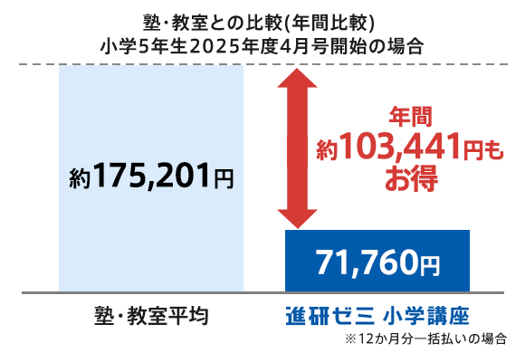 • 2025年度「進研ゼミ 小学講座」5年生12か月分一括払いで4月号開始の場合の金額(税込)との比較。