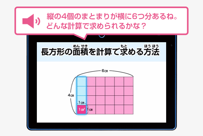 いきなり公式を覚えさせるのではなく、おうちのかたが教えるのが難しい「どうしてそうなるの?」を考えさせるレッスンだから、受け身にならずに学習に取り組めます。