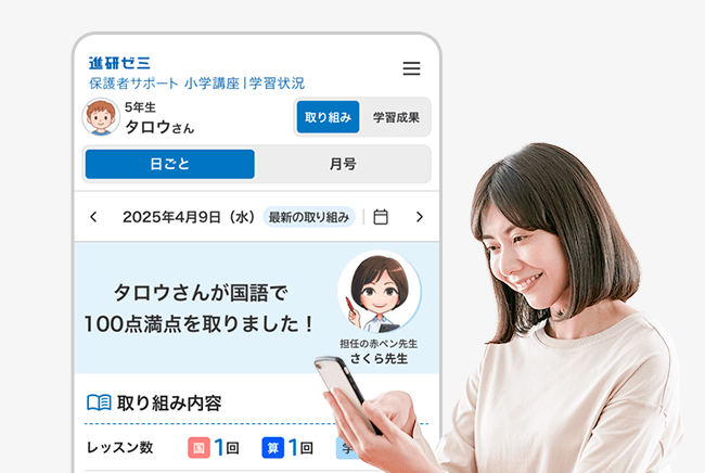 担任の「赤ペン先生」がお子さまの取り組み状況をお伝えするので、忙しい毎日の中でも手軽にお子さまの頑張りがわかります。