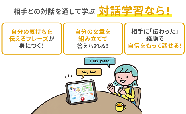 「まずは話してみること」が英語力を伸ばすスタートライン。AIキャラとの会話を通して、英語を話したくなる意欲を高め、英語での会話に慣れ親しんで、自信がもてます。