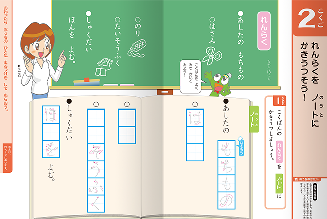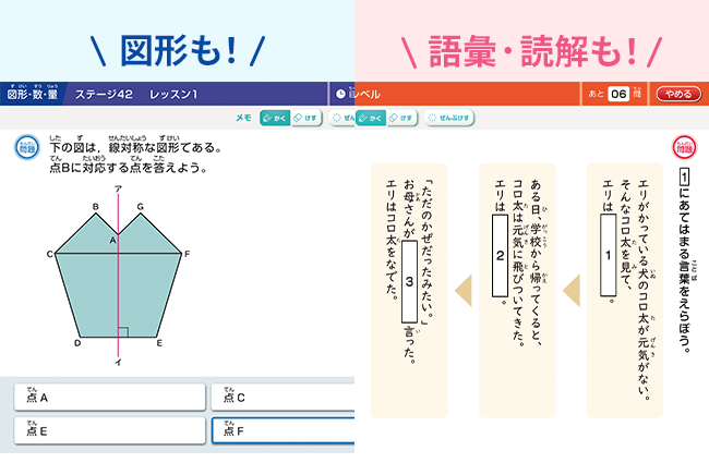1年生からは漢字と計算だけではなく、読解や語彙、図形の問題にも取り組めるようになり、さらに国語と算数の力を伸ばすことができます。