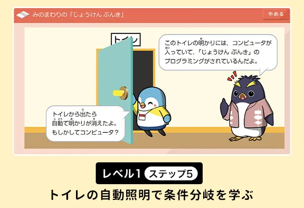 「プログラミング講座」を受講しているおかげで、小学校でプログラミングをやったときに、スイスイ進めることができました。また、「プログラミング講座」レベル1で、トイレの自動照明で、「条件分岐」を習いました。家の近くにも僕が通ると電気がつく道路があって、「これってプログラミングだ!」と気づくことができたので、うれしかったです。