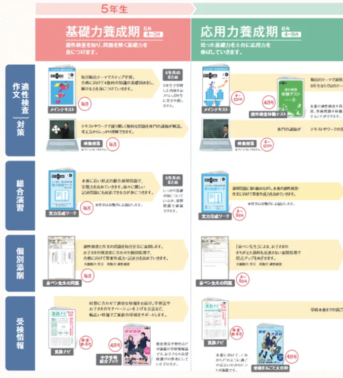 - 映像授業は毎月テキスト5本・ワーク3~5本 (1本あたり約5~10分)、受験情報系動画3本(6年生のみ。1本あたり約5~10分)です。