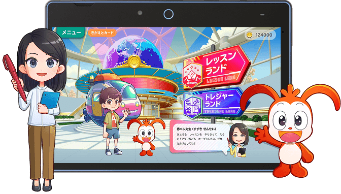 ヒントや促しをくれるキャラクターたちと一緒に、実際に書き込んだり、動かしたりしながら、楽しく内容を理解できます。