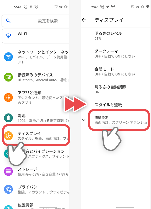 2.設定画面にて「ディスプレイ」を選択後、「詳細設定」を選択